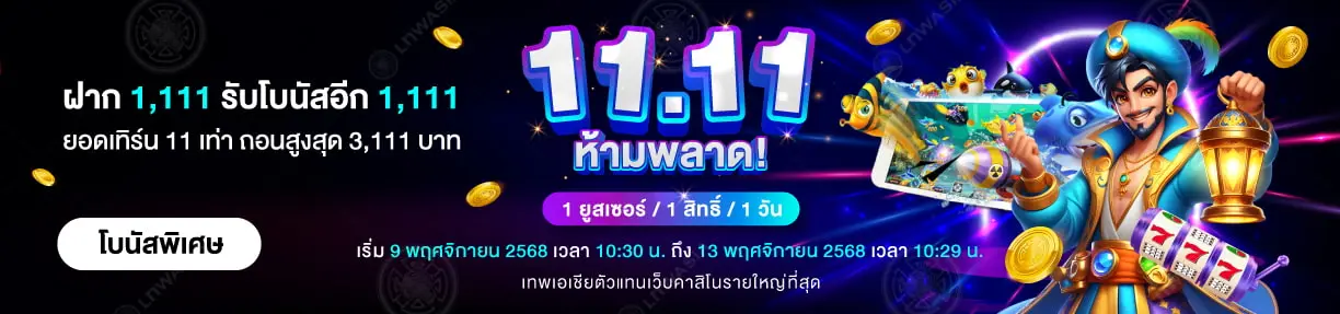 11.11 ห้ามพลาด! ฝากเพียง 1,111 บาท รับโบนัสอีก 1111 บาท! โบนัสพิเศษมอบให้เฉพาะสมาชิกเทพเอเชีย ยอดเทิร์นโอเวอร์เพียง 11 เท่า ถอนได้สูงสุด 3,111 บาท สมาชิก 1 ยูสเซอร์ รับ 1 สิทธิ์ต่อ 1 วัน เฉพาะเกมสล็อตและยิงปลาจีคลับ